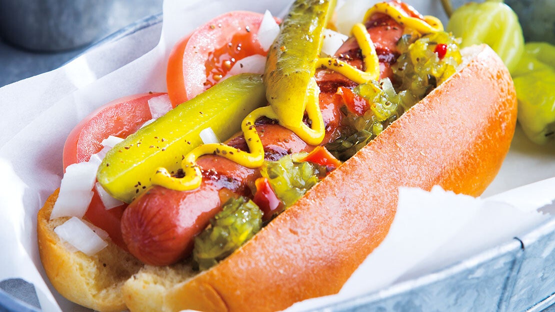 Chicago Hot Dog: Un perrito caliente de carne de res, servido en un pan con semillas de amapola, mostaza, relish dulce verde, cebolla, rodajas de tomate, pepinillo eneldo, pimientos picantes y una pizca de sal de apio. ¡La regla de oro es que NUNCA lleva kétchup!